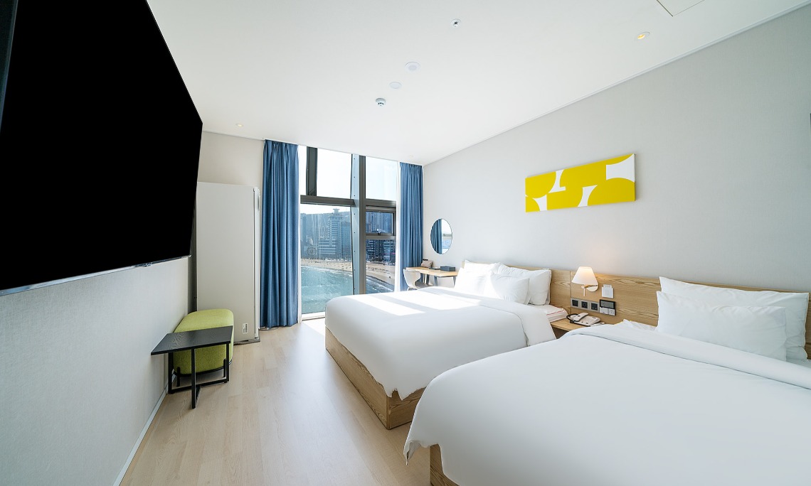 시그니처 패밀리트윈 객실은 광안리 해변가를 객실에서 보실 수 있는 오션뷰 객실입니다. 통창으로 이루어져 있고 대형 침대가 구비되어 가족형으로 인기있는 객실입니다. 더블베드2 + 이불요세트 제공가능합니다. 욕조